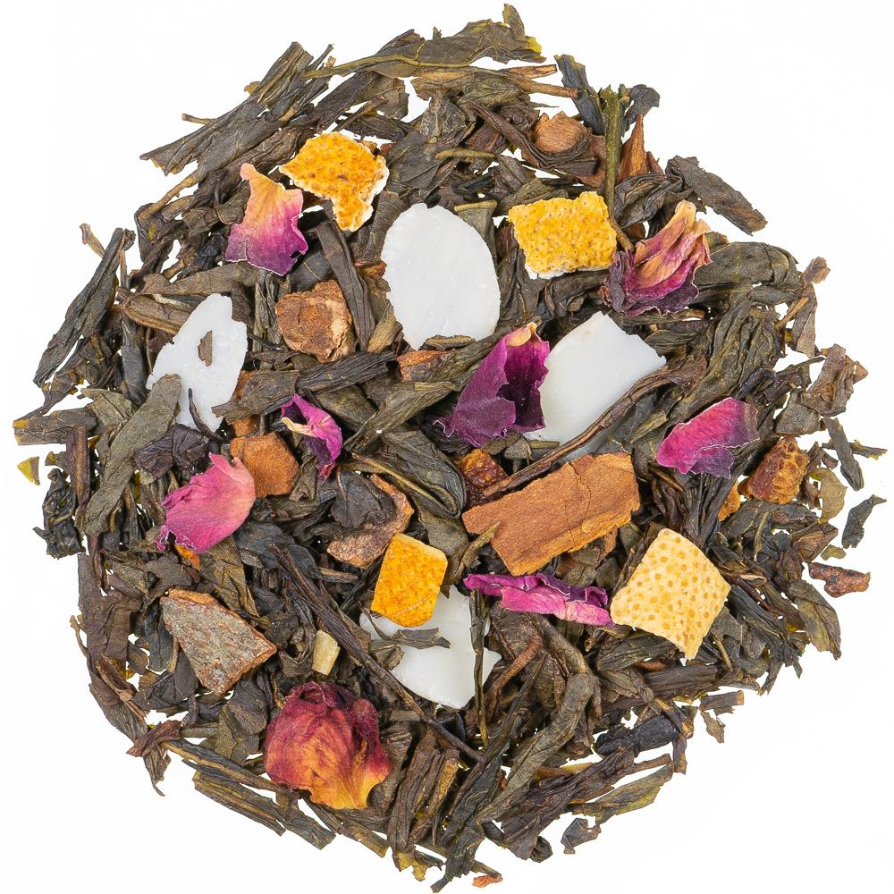 Zutaten: Grüner Tee China Sencha, Orangenschalen, Zimtrinde(6%), Aroma, Mandelflakes2%), Rosenblütenblätter