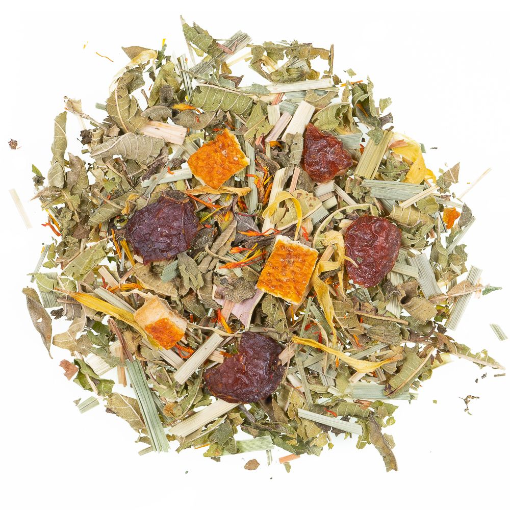 Zutaten: Lemongras, Hagebuttenschalen, Verbenenkraut, Melissenblätter, Orangenschalen(7%), natürliches Aroma, Ringelblumenblüten, Saflorblüten