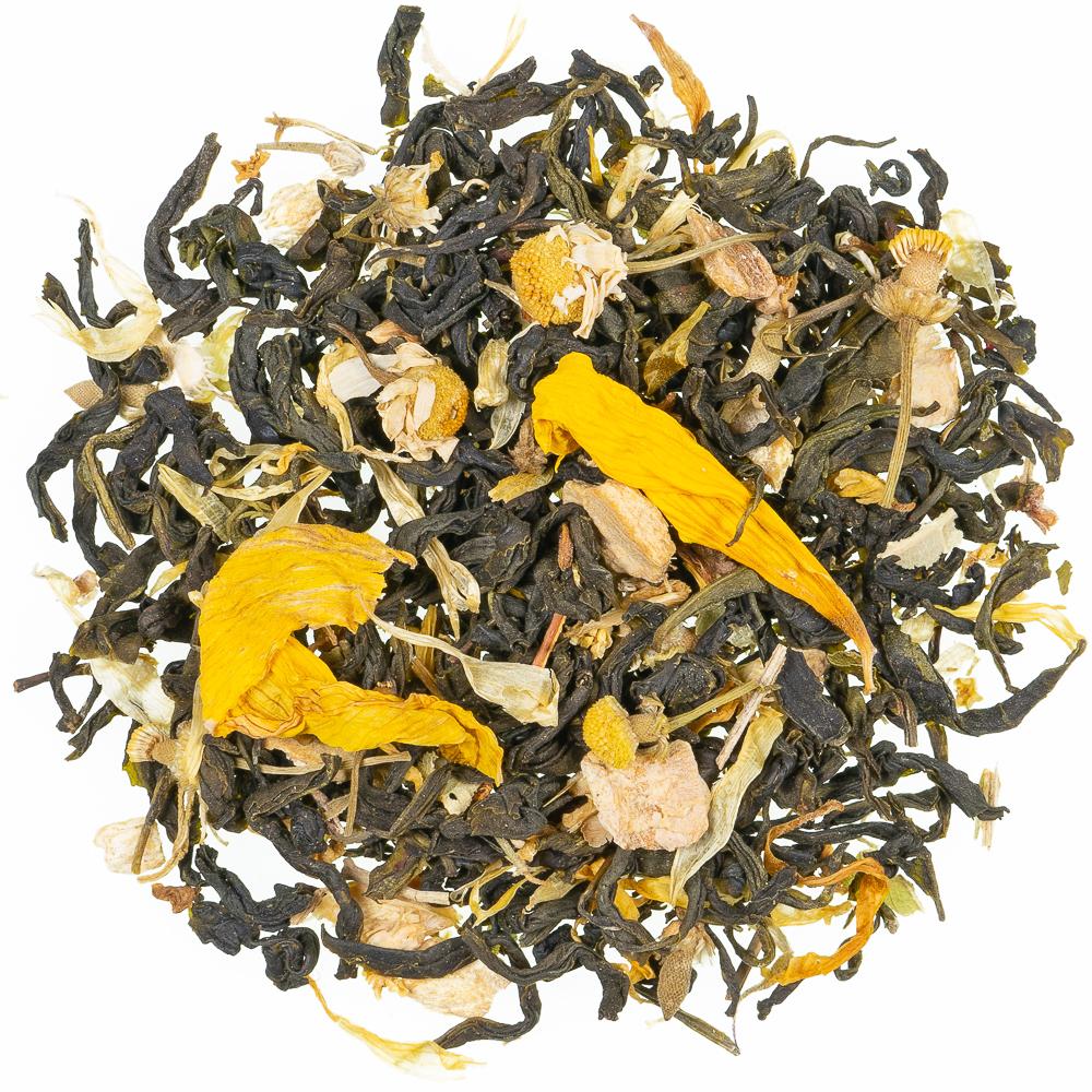 Zutaten: Grüner Tee China Wu Lu*, Ingwerstücke*, natürliches Frucht-Zitrus-Aroma, Kamillenblüten*(4%), Zitronenschalen*(2%), Lindenblüten*, Holunderblüten*, Ringelblumenblüten*, Sonnenblumenblüten*