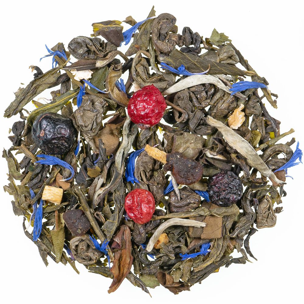 Zutaten: Grüner Tee China Sencha, -Ming Mee, weißer Tee China Pai Mu Tan, grüner Tee China Gunpowder, grüner Tee China Wu Lu, Aroma, rote und schwarze Johannisbeeren, Ginsengwurzel, Kornblumenblüten, Aprikosenstücke (Aprikose, Reismehl)(1%)