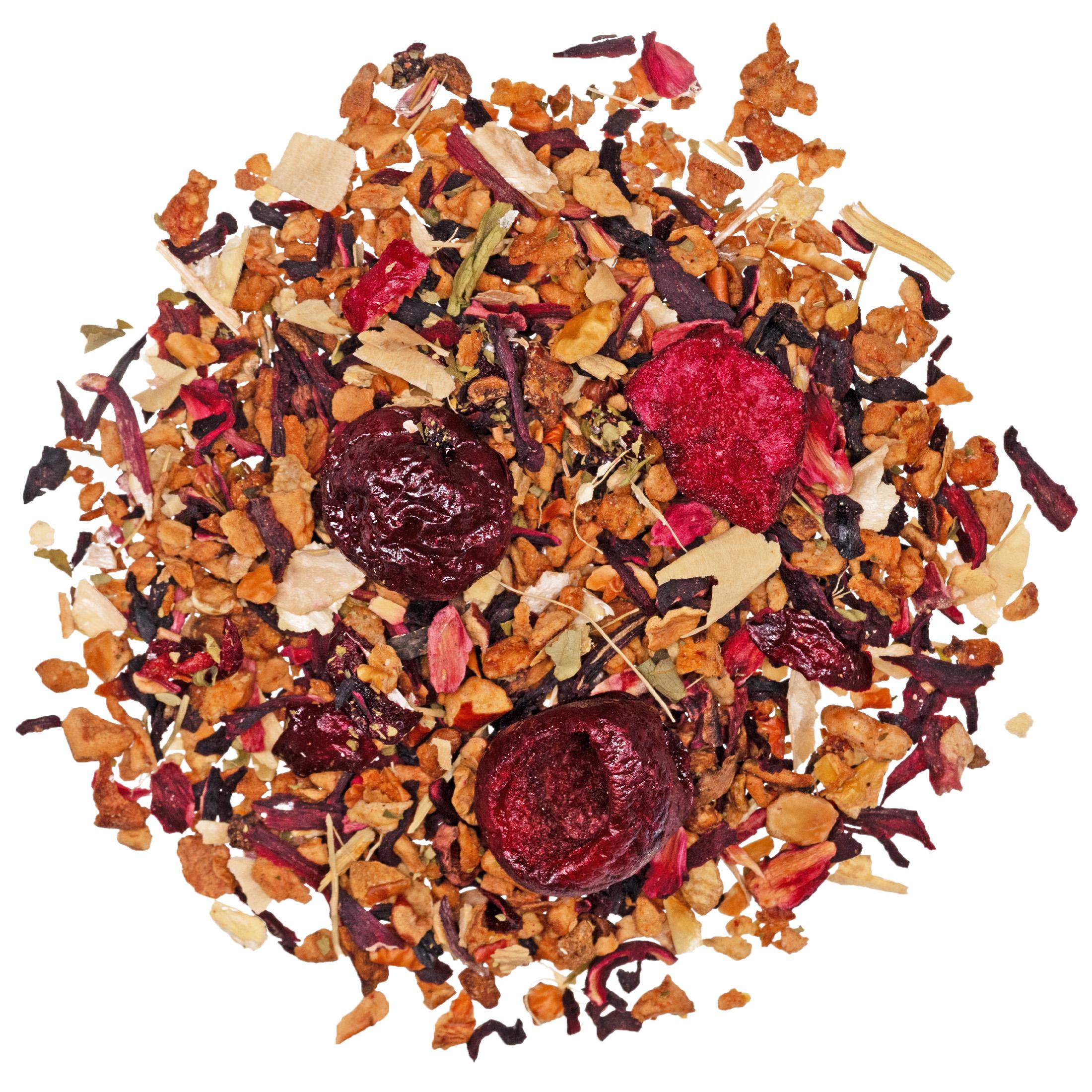 Zutaten: GApfelstücke, Hibiskusblüten, Aroma, Bohnenschalen, Ingwerstücke, Sauerkirschen(3%), Moringablätter, Süßkraut, Tamarinde