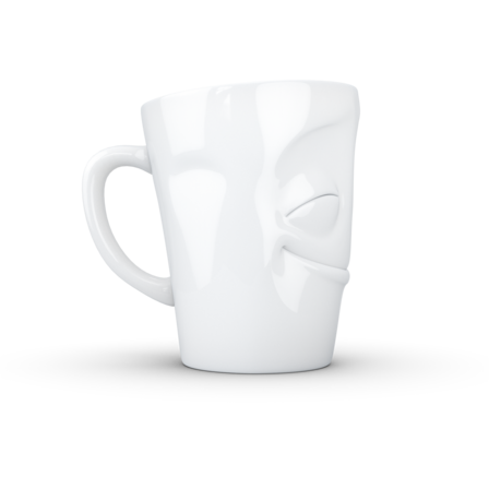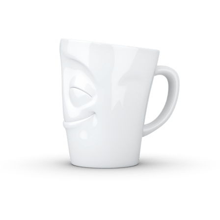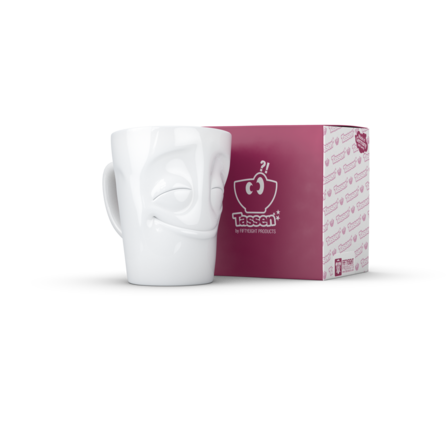 Unser Henkelbecher „Vergnügt“ in weiß.