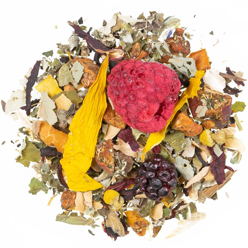 Zutaten: Apfelstücke (Apfel, Säuerungsmittel: Zitronensäure), Hibiskusblüten, Brombeerblätter, Pfefferminzblätter(8%), Bohnenschalen, Kamillenblüten, Himbeerblätter, Aroma, Sonnenblumenblüten, Brombeeren, Himbeeren(0,5%)