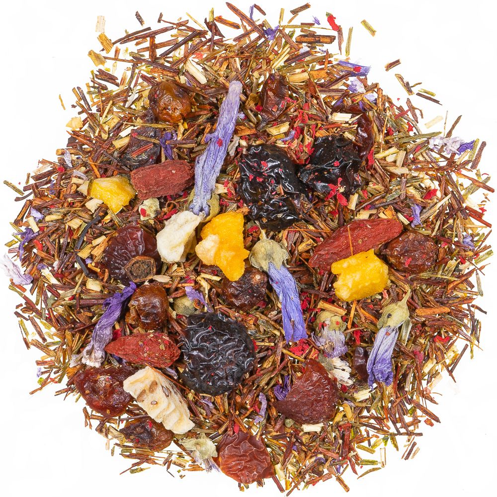 Grüner Rooibostee, aromatisiert Eine leuchtende Tassenfarbe und ein süß-säuerlicher Geschmack. Fein aufeinander abgestimmt bieten sie in diesem Tee einen Fruchtgenuss, der intensiv und spritzig ist.