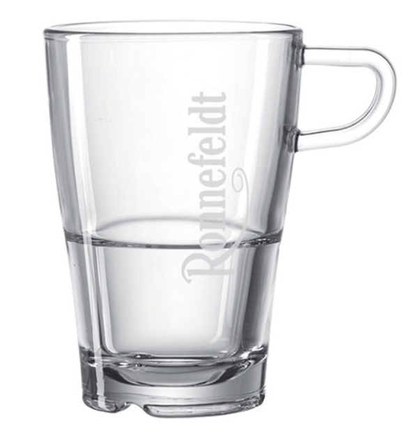 Formschönes hohes, schlankes Teeglas, Füllmenge 0,32 l (randvoll) mit Ronnefeldt-Schriftzug in halbtransparent weiss.