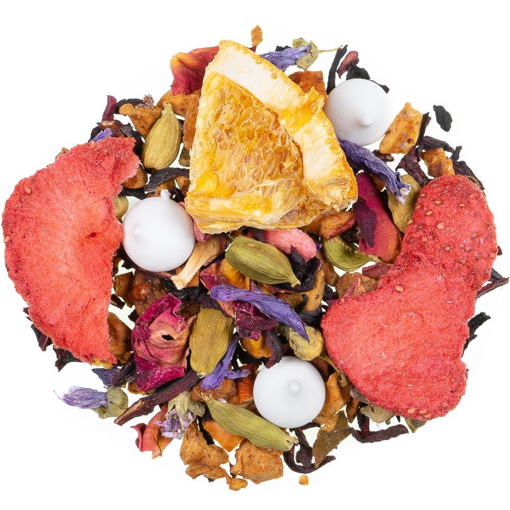 Zutaten: Apfelstücke, Hibiskusblüten, Guavestücke, Aroma, Orangenstücke, Zimtrinde, Kardamom(4%), Erdbeerscheiben(2%), Schaumzuckertropfen (Zucker, Glukosesirup, Gelatine, Salz), Rosenblütenblätter, Malvenblüten