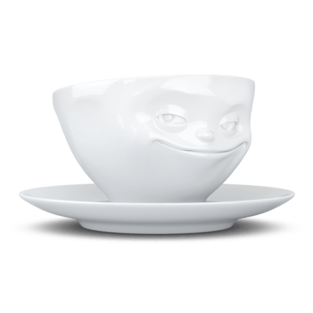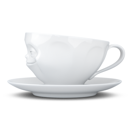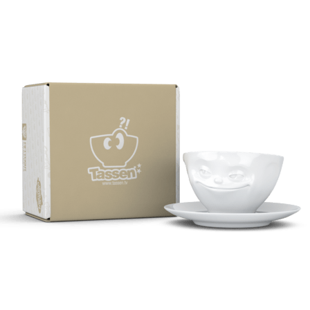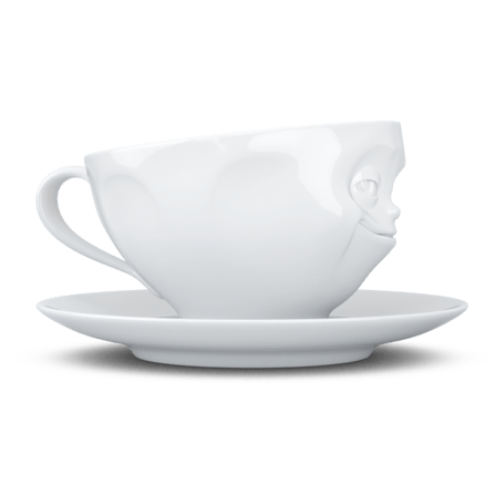 Mit Henkel und Unterteller – für eine große Tasse Kaffee, Tee oder Kakao.