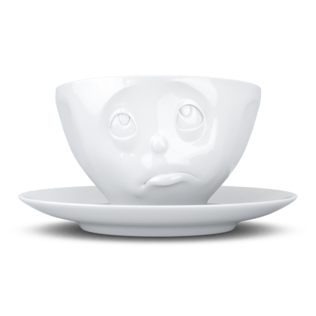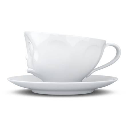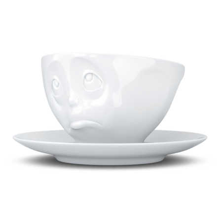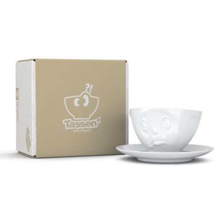 Mit Henkel und Unterteller – für eine große Tasse Kaffee, Tee oder Kakao.