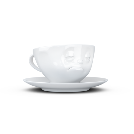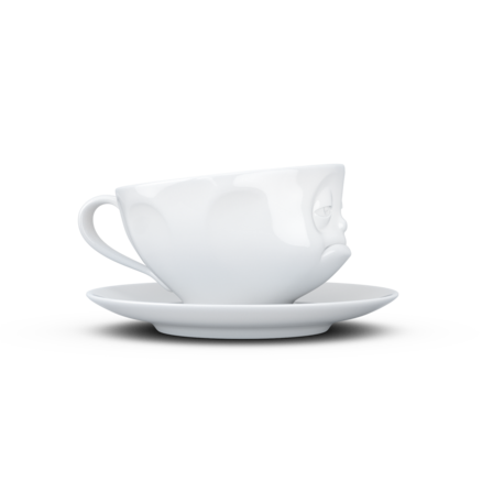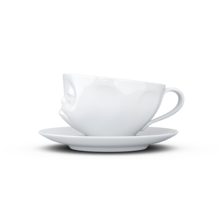 Mit Henkel und Unterteller in weiß lassen sich Kaffee, Tee und Kakao schmackhaft präsentieren.