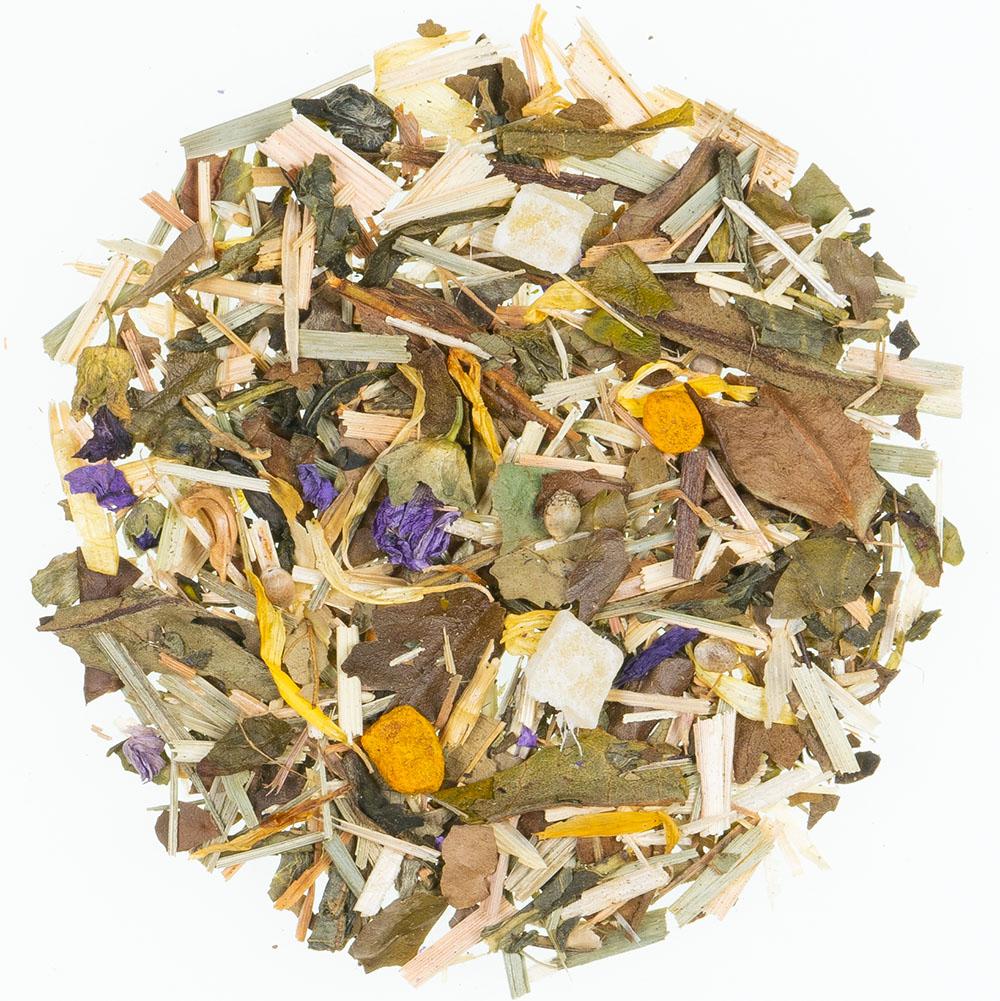 Zutaten: Grüner Tee, weißer Tee, grüner Hafer, Lemongras, natürliches Aroma, süße Brombeerblätter, kandierte Mangostücke (Mango, Zucker)(4%), Kurkuma, Hanfsamen(2%), Malvenblüten, Ringelblumenblüten, Spirulinapulver