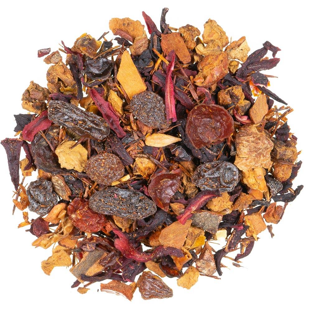 Zutaten: Apfelstücke, Hibiskusblüten, Weinbeeren, Rooibos, Hagebuttenschalen, Zimtrinde(5%), Aroma, Pflaumenstücke (Pflaumen, Reismehl)(4%)